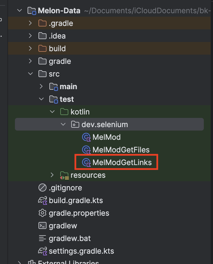 Our first objective is to crawl a list of article links from the Melmod website. To achieve this, create a new class, MelModGetLinks.kt, within the test module.