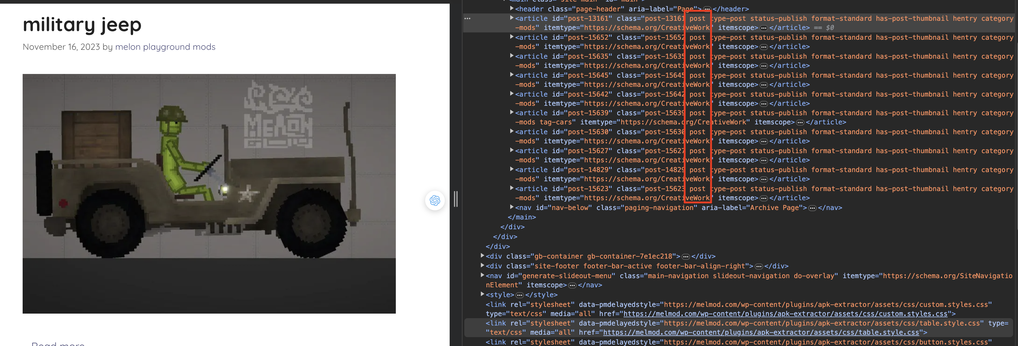 We have everything to do. Get back to the MelMod website. As we can see, every article has post inside class attribute: