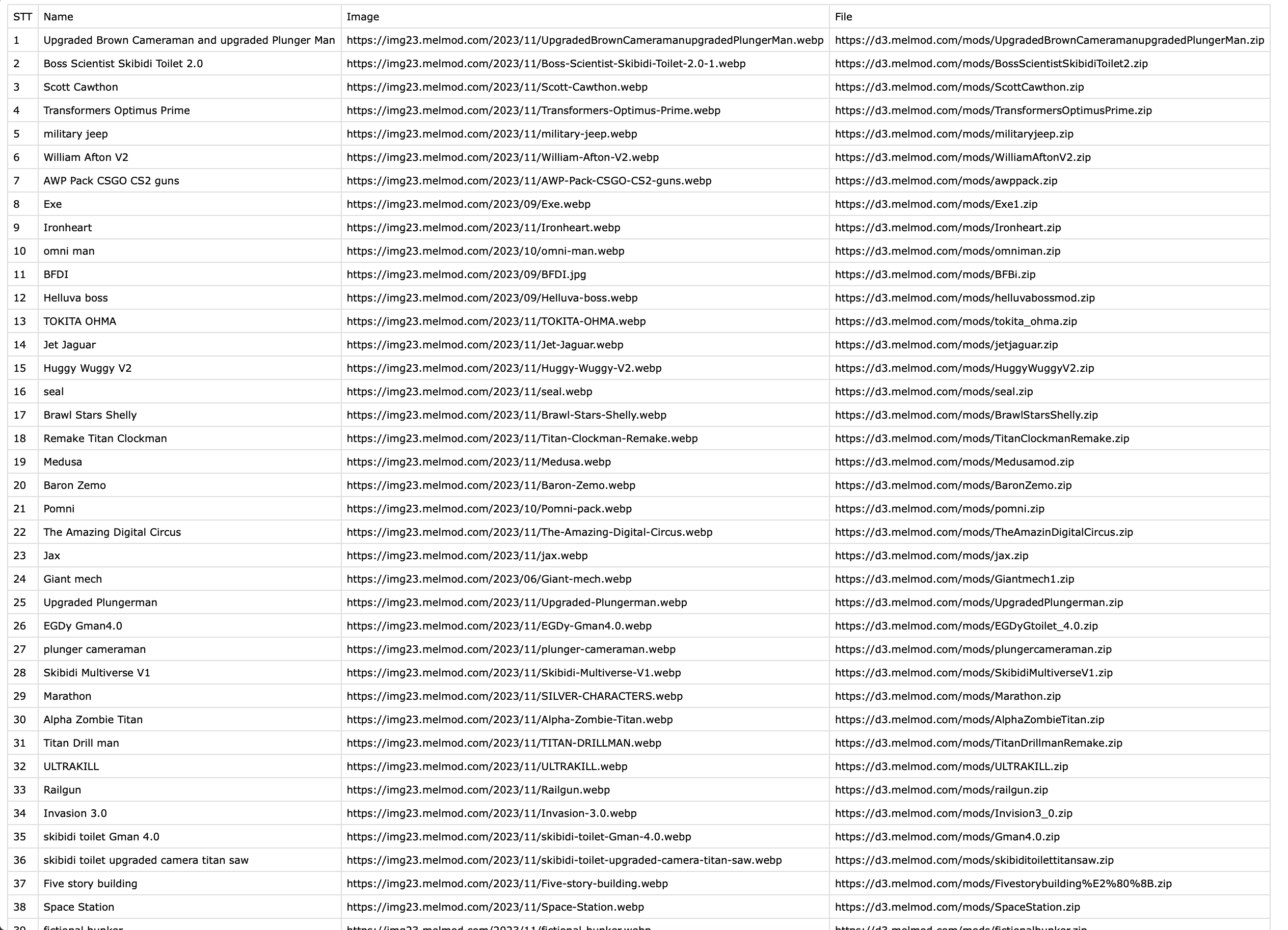 driver.get("https://melmod.com/mods/")// The output CSV file